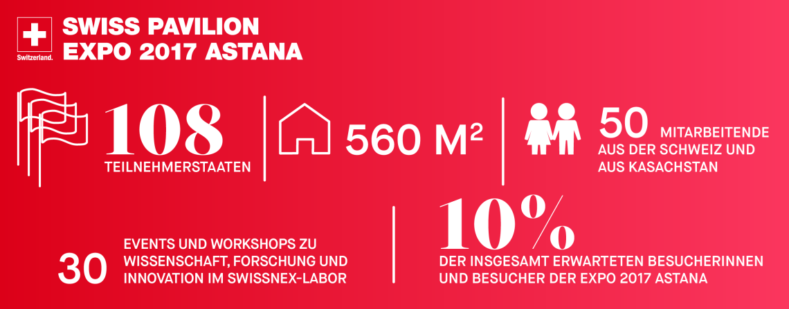Der Schweizer Pavillon an der Expo 2017 in Astana lädt die Besucherinnen und Besucher dazu ein, über ihren Energieverbrauch und ihren Umgang mit natürlichen Ressourcen nachzudenken. Im Zentrum stehen erneuerbare Energien, Energieeffizienz und Nachhaltigkeit. Der Pavillon lädt aber auch dazu ein, die Schönheit der Natur zu entdecken, und wirbt für den Standort Schweiz als guten Nährboden für wissenschaftliche Forschung und Innovation.