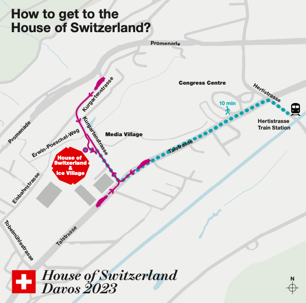 Während des WEF, eines der wichtigsten öffentlichen und privaten Wirtschaftstreffen der Welt, wurde aus der Eissporthalle im Zentrum von Davos vorübergehend ein Ort der Kommunikation und des Networkings. Dies stellte für Präsenz Schweiz des Eidgenössischen Departements für auswärtige Angelegenheiten (EDA) eine grosse Herausforderung dar. Die verschiedenen Innenräume des Stadions wurden für offizielle Veranstaltungen der Schweiz zum WEF-Thema 2023 «Cooperation in a Fragmented World» (Zusammenarbeit in einer fragmentierten Welt) genutzt. Das House of Switzerland bot Raum für die Ausarbeitung und Lancierung neuer Ideen zur Bewältigung aktueller und globaler Herausforderungen, zu denen unterschiedliche Events geplant waren.