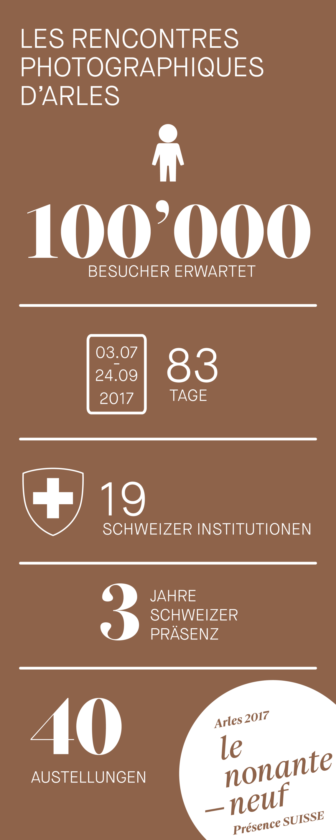 Drei Jahre schon! Bereits zum dritten Mal ist die Schweiz Partnerin der Rencontres, des jährlichen Fotografietreffens in Arles. Es bietet eine einzigartige Gelegenheit zum Austausch und überdies zur Darstellung unseres Landes in Form von Bildern, die die kulturelle Vielfalt der Schweiz zeigen. Mit Stolz und Freude stellt die Schweiz hier ihre Künstlerinnen und Künstler, ihre Institutionen, Schulen und Festivals, ihre Verlage und ihren nonante-neuf vor.