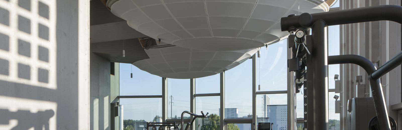 Den Energieverbrauch von Wellness-Anlagen massiv senken und die verbleibende Energie selber produzieren: Das ist das Konzept der Unit «Solare Fitness & Wellness». Sie ist Teil von NEST, der modularen Forschungs- und Innovationsplattform auf dem Campus der Empa in Dübendorf, und thront auf der obersten Plattform des Gebäudes. Zwei rund acht Meter hohe Glasfassaden sind der Blickfang von aussen. Der architektonische Entwurf des Architekten Peter Dransfeld ist aber auch im Innern spektakulär: In dem durchgängig offenen Raum schweben drei Ellipsoiden von der Decke; sie beherbergen zwei Saunas und ein Dampfbad. Unter den Wellness-Modulen laden Fitness-Geräte zum Trainieren ein. Schon bald werden diese von den Mitarbeitenden der beiden Forschungsinstitute Empa und Eawag genutzt.