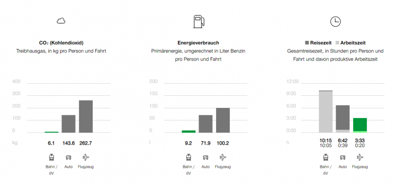 Die Verbraucher haben es in der Hand: Für jede Bahnstrecke und Nachtzugverbindung kann die genaue Co2-Menge, der Energieverbrauch wie auch die Reisezeit berechnet und dem Auto und Flugzeug gegenübergestellt werden. Auf sbb.ch gibt man die gewünschte Strecke ein und kann den angezeigten Umweltrechner aufrufen.