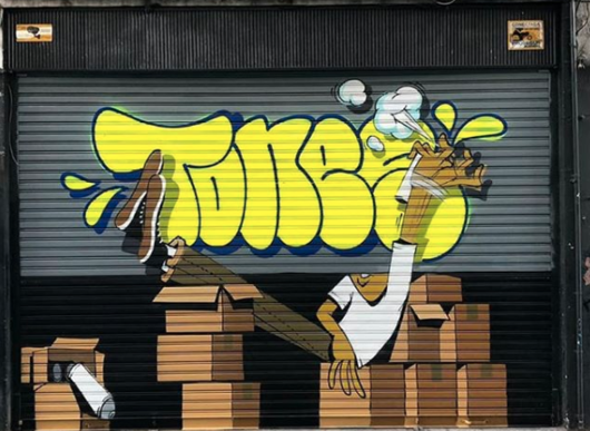 Die amerikanische Ästhetik der 1980er-Jahre und der Austausch mit den Stars der New Yorker Graffitiszene haben Tones massgeblich beeinflusst. Er beschreibt seinen Stil als «fun» und «funky». Stellen Sie sich elastische, tanzende Buchstaben vor, dazu fröhliche, langgliedrige Figuren – eine Hommage an die geliebten Comics. Ein Werk von Tones ist auf dem Rollladen eines Kiosks an der Rue des Eaux-Vives zu sehen. Dieses Auftragswerk realisierte er unter erschwerten Bedingungen. «Es war Ende Dezember, 4 Grad, und ich konnte nur ausserhalb der Öffnungszeiten arbeiten, das heisst zwischen 2 und 9 Uhr morgens», erinnert sich Tony. «Aber jetzt bringt mein Graffiti die Leute auf dem Arbeitsweg zum Schmunzeln.»