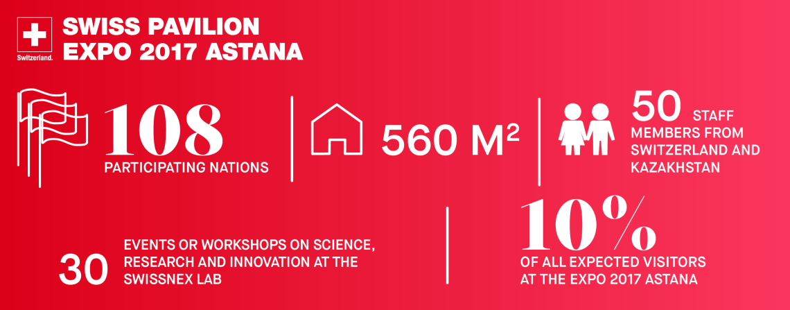 The Swiss pavilion at Expo 2017 in Astana encourages visitors to reflect on their energy use and the management of natural resources. It informs the public about energy efficiency and sustainability, with the focus on renewable energy sources. It also shows off the beauty of the Swiss countryside and promotes Switzerland as fertile ground for scientific research and innovation.