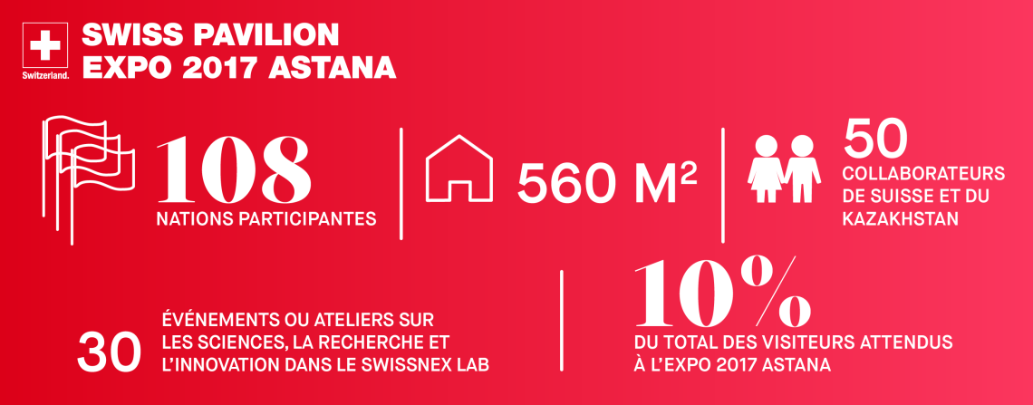 Le Pavillon suisse de l’Expo 2017 Astana invite les visiteurs à la réflexion sur leur consommation d’énergie et la gestion des ressources naturelles. Avec un accent sur les énergies renouvelables, il les informe sur l’efficacité énergétique et la durabilité. Il propose également au public de découvrir la beauté des paysages helvétiques et souligne l’attrait de la Suisse en tant que terreau fertile pour la recherche scientifique et l’innovation.