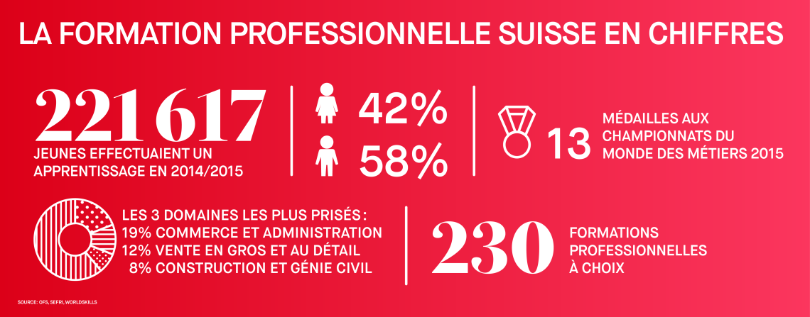 A la fin de leur scolarité obligatoire, les jeunes Helvètes ont le choix entre poursuivre leurs études ou opter pour la voie de la formation professionnelle, majoritairement «duale». Cette dernière combine école et pratique. La base est un apprentissage en entreprise de trois à quatre jours de travail par semaine, couplés à des cours dans une école professionnelle. La formation, durant laquelle l’apprenti est payé par l’employeur, dure entre deux et quatre ans, puis couronnée d’un certificat fédéral de capacité (CFC) ou d’une attestation fédérale de formation professionnelle (AFP). L’ancien apprenti peut alors se lancer directement sur le marché du travail ou entamer une formation supérieure. Beaucoup de chefs de petites et moyennes entreprises suisses ont suivi cette filière.