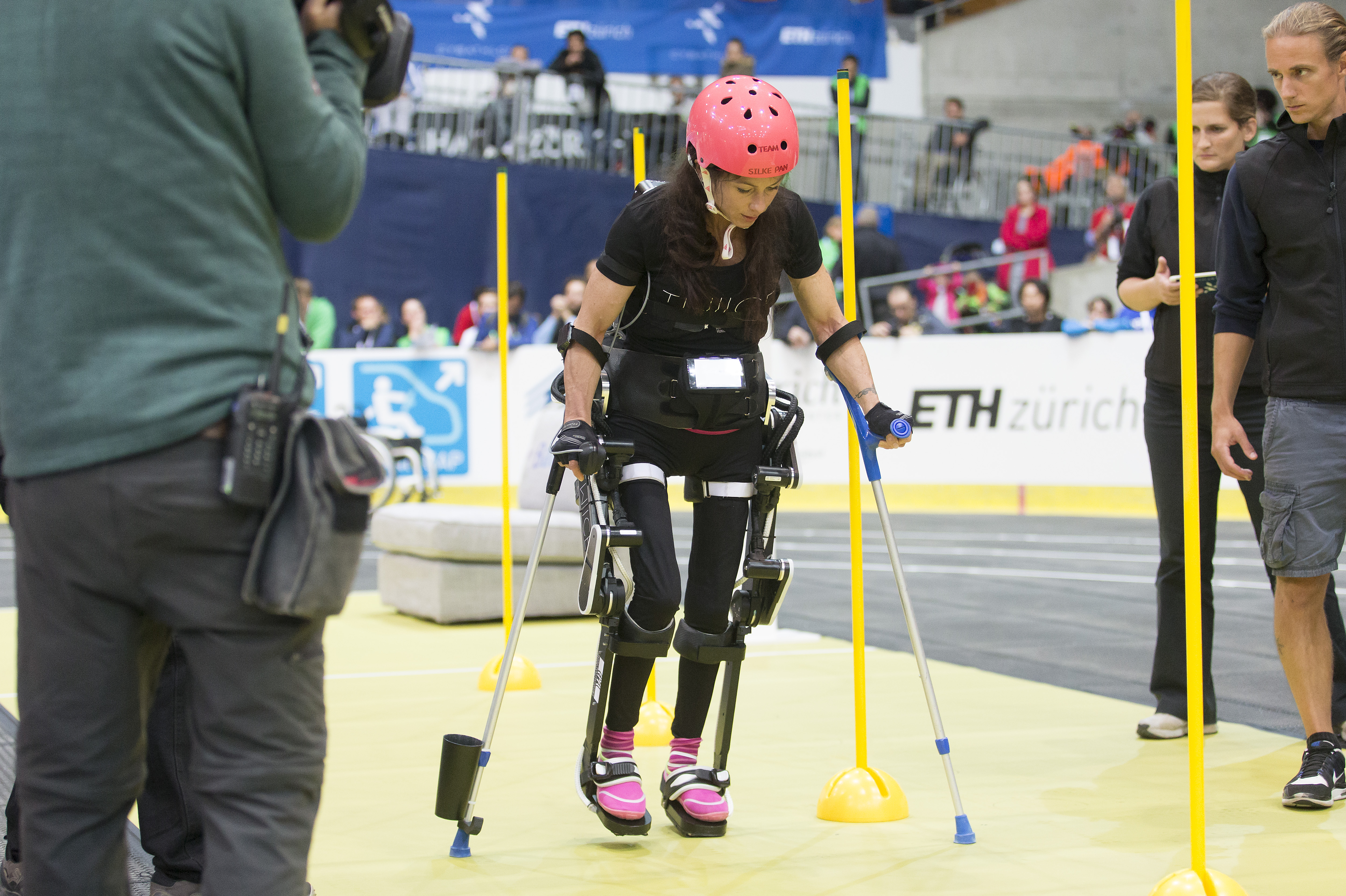 - Lors de la course d’exosquelettes robotisés, les pilotes dont les jambes sont complètement paralysées à cause d’une lésion de la moelle épinière exécutent des activités du quotidien telles que marcher sur un terrain accidenté ou circuler entre des meubles.