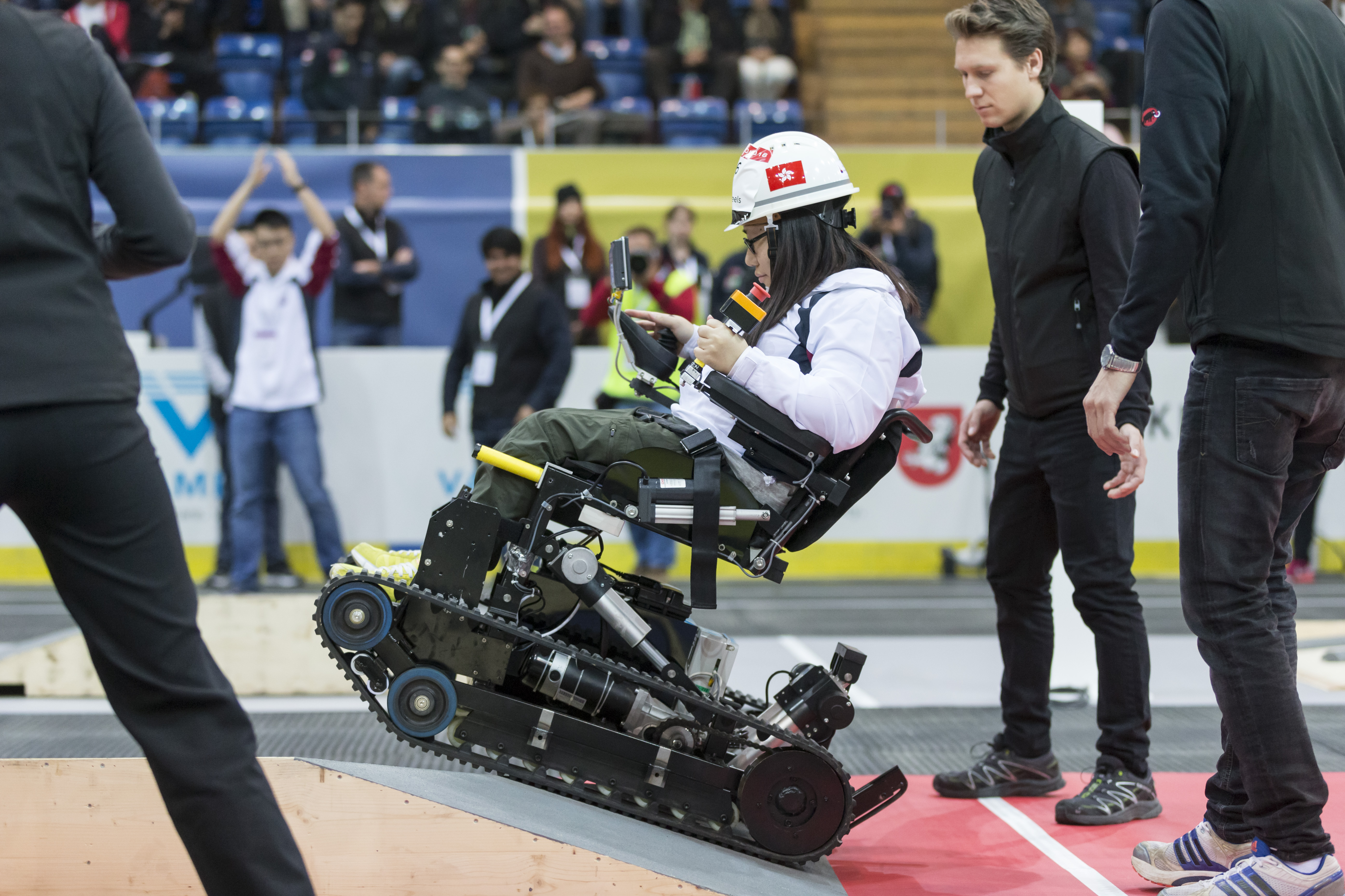 - Des pilotes souffrant d’un lourd handicap moteur s’affrontent dans une course de fauteuils roulants motorisés. Ils doivent effectuer des manœuvres dans un espace très restreint et gravir une pente à l’aide d’une manette, d’un dispositif de commande par la langue ou d’un pavé tactile.