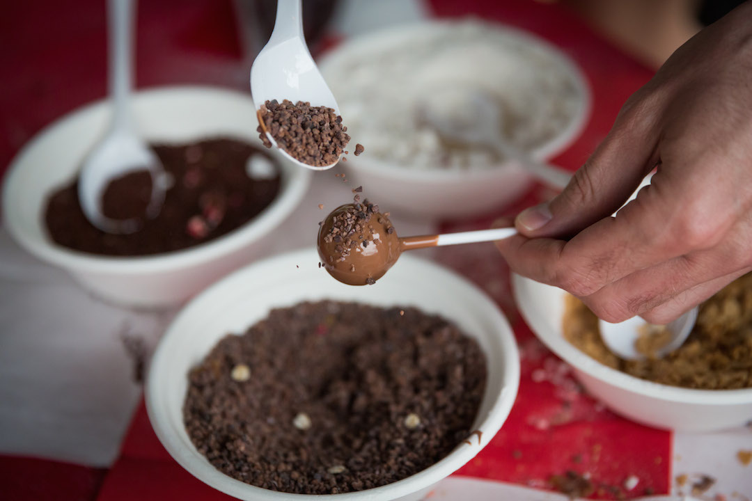 Chocolate master Jean-Baptiste Jolliet (2nd place in the Swiss Chocolate Masters of 2013, and selected for the Coupe du Monde de la Pâtisserie 2017) is the Swiss genius behind these original lollies, which are made from a ganache specially prepared for the House of Switzerland using Swiss cream.