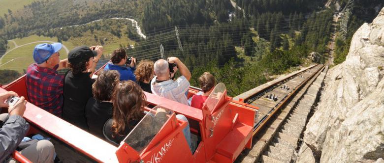 La più lunga scala del mondo, la più lunga funicolare d’Europa: la funicolare del Niesen può vantare molti primati. Il tracciato porta da Mülenen fin sulla cima del Niesen, una montagna a forma di piramide nei pressi del lago di Thun. La scala accanto ai binari, con i suoi 11 674 gradini, si può percorrere a piedi solo una volta all’anno per la corsa del Niesen.