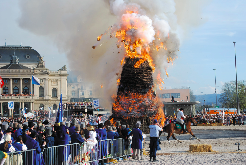 The high point of this traditional festival celebrated in Zurich on the 3rd weekend of April is the burning of an effigy of Old Man Winter. Originally, the Böög was an unpleasant masked character who frightened children during carnival.