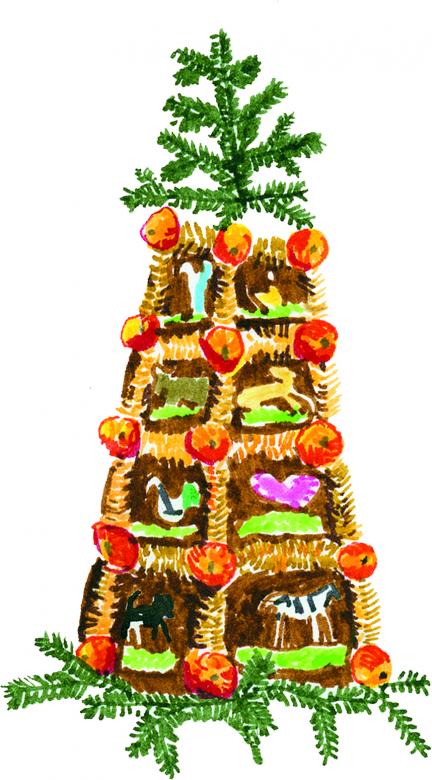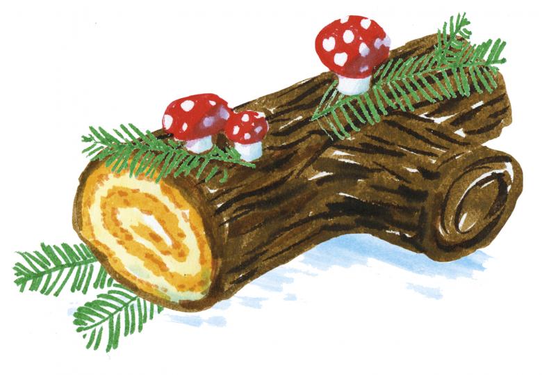 The cake is so pretty, you almost don’t want to eat it! It’s made to look like the branch of a tree, but it’s really a spongy cake with a buttery cream filling. A layer of chocolate on the outside is the tree bark, and there are marzipan ladybugs, leaves, and mushrooms for decoration. In olden times, farming families gathered around the fireplace at Christmas and burned a large log, then scattered the ashes on the field – as thanks for the harvest and for good luck in the coming year. Today in Switzerland it’s unusual to have a fireplace – and very uncommon to have a field next to the house. So instead, people sit at a festively decorated table and eat a piece of Yule log cake (bûche de Noël).