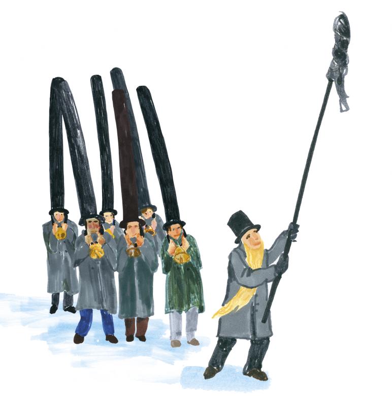 You can’t put on this costume by yourself. The big black top hats are up to 4 metres (13 feet) high and have to be fixed in place using wooden slats and tape – helping hands are a must. At the parade – that takes place on Christmas Eve – the highest hats come first, followed by the medium-sized hats, then the normal-sized hats. At the stroke of nine in the evening, the curious-looking men start moving forward, stepping in time to the sounds of the ringing church bells. At the very start is a man with a white beard and a long stick that has a sooty rag tied to it. If you get too close to a hat-wearer, he’ll swat you with the rag. After forty-five minutes, the parade is over and the men head to the village restaurants for Christmas Eve refreshments.