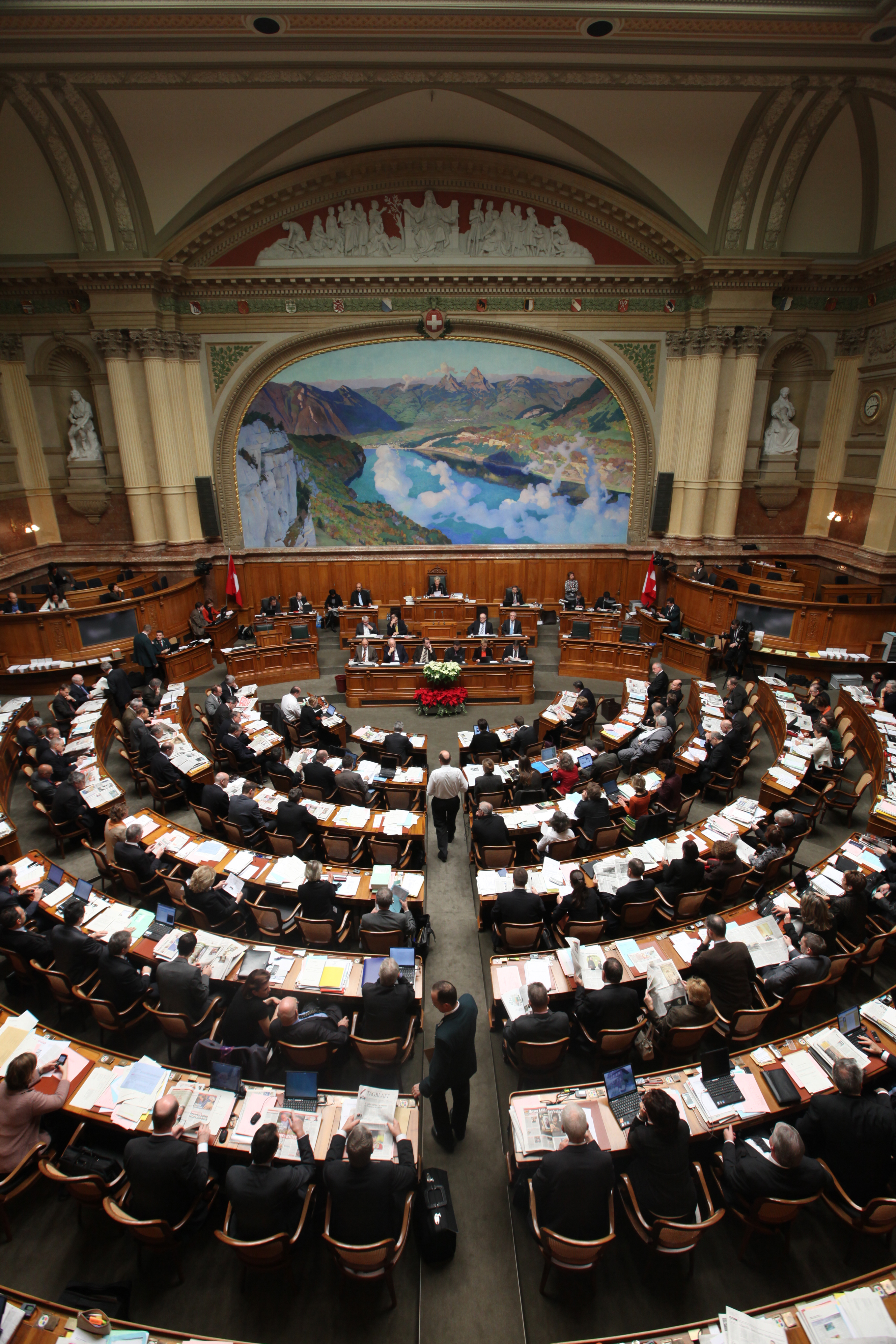 The Federal Assembly, comprising the 200 elected members of the National Council (the 'lower chamber', representing the people) and the 46 elected members of the Council of States (the 'upper chamber', representing the cantons), elects the President of the Swiss Confederation from among the seven members of the Federal Council. This election takes place in December each year during the winter parliamentary session. This annual rotation is the reason people outside Switzerland – and sometimes even within Switzerland – often do not know the name of the current President.